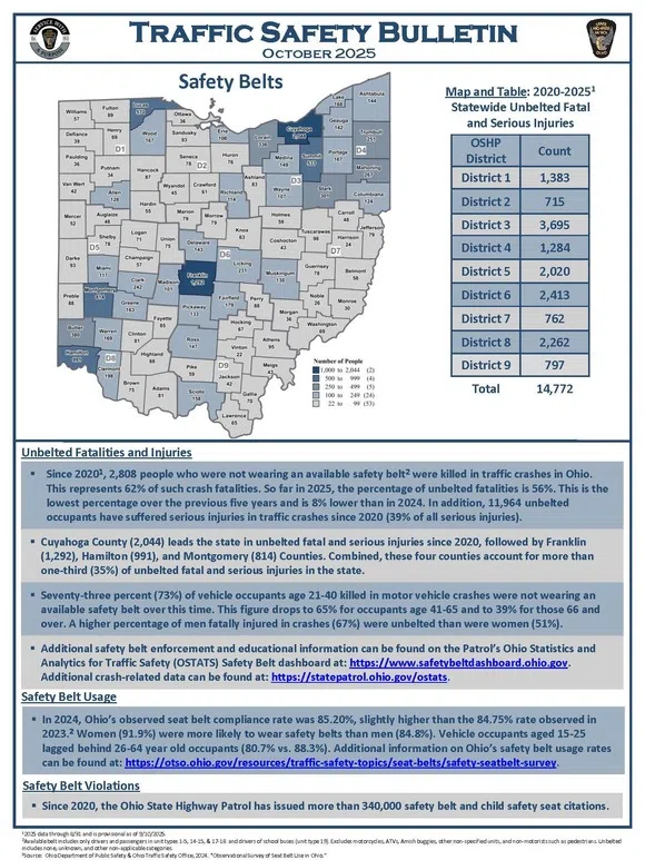 The Patrol remains committed to ensuring the safety of all who travel on Ohio’s roads. Troopers will continue to enforce safety belt laws as part of their daily patrol duties, with the goal of reducing fatalities and serious injuries. By taking just a few seconds to buckle up, you can protect yourself and your loved ones.