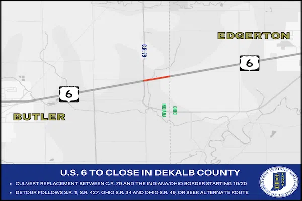 DEKALB CO., Ind. (ADAMS) – The Indiana Department of Transportation has announced the closure of U.S. 6 near the state line with Ohio for a culvert replacement.