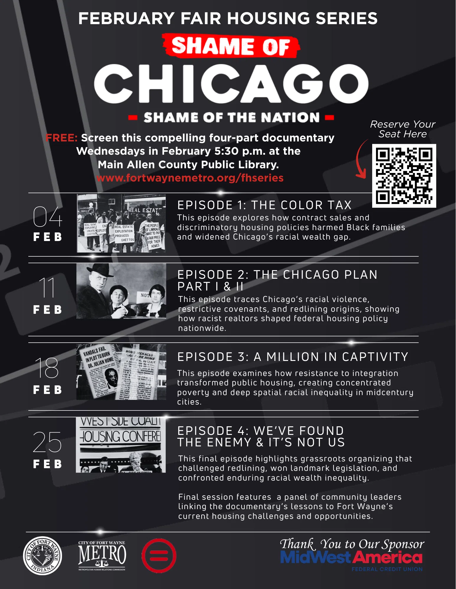 FORT WAYNE, Ind. (ADAMS) – Residents will have the opportunity to view the compelling four-part documentary The Shame of Chicago, Shame of the Nation for free during the February Fair Housing Series taking place on Wednesday evenings in February.