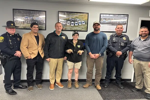 Pictured from left to right: Capitol Police Sergeant Robert Johnson, FBI Special Agent Thomas Del Coco, Indianapolis Zoo VP of General Operations John Gullion, Indianapolis Zoo Keeper Allison Hinton, USDA-OIG Special Agent Justin Adams, Pendleton Police Sergeant Shane Isaacs and Pendleton Police Captain Lucas Traylor
