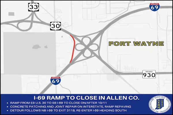 ALLEN CO., Ind. (ADAMS) - The Indiana Department of Transportation (INDOT) says that the I-69 ramp from eastbound U.S. 30 to southbound I-69 will close for work. Starting on or after October 11, crews...