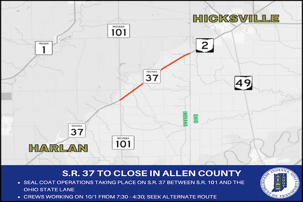 ALLEN CO., Ind. (ADAMS) - The Indiana Department of Transportation (INDOT) says that crews will close State Road 37 for seal coat operations. Work on the seal coating is scheduled to take place on Oct...